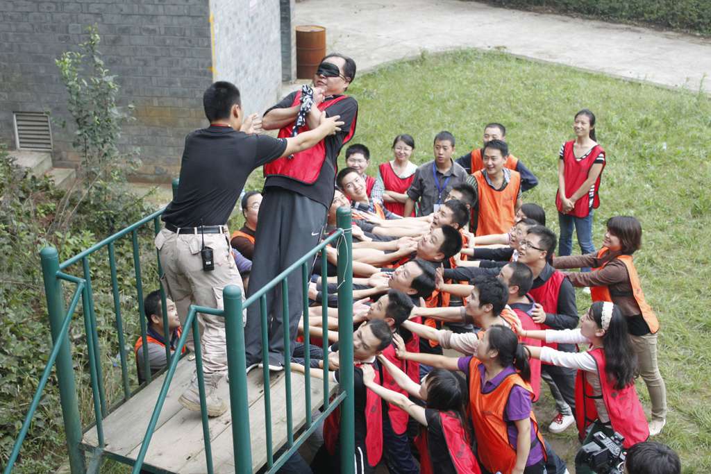 全體成員要在規定的時間內翻越一面4.2米的光滑的墻面,在此過程中,大家不能借助任何外界的工具,包括衣服、皮帶、繩子等。所能用的資源只有每個人的身體。當培訓師講完這個科目的要點時,我看著這堵4.2米的高墻,心里困惑這怎么可能上去呢?豈料,隊伍中已經快速計劃、組織、協調力量,密切合作起來,神速般的達成了默契,兩位隊友很快翻越高墻,并招手迎接新的攀登者。將這看似不可能完成的任務變成了現實,這些高高在上的“純爺們”,戰勝困難的決心和信心,讓我們心生贊美。大家的團結一致,并沒有落下任何隊員。